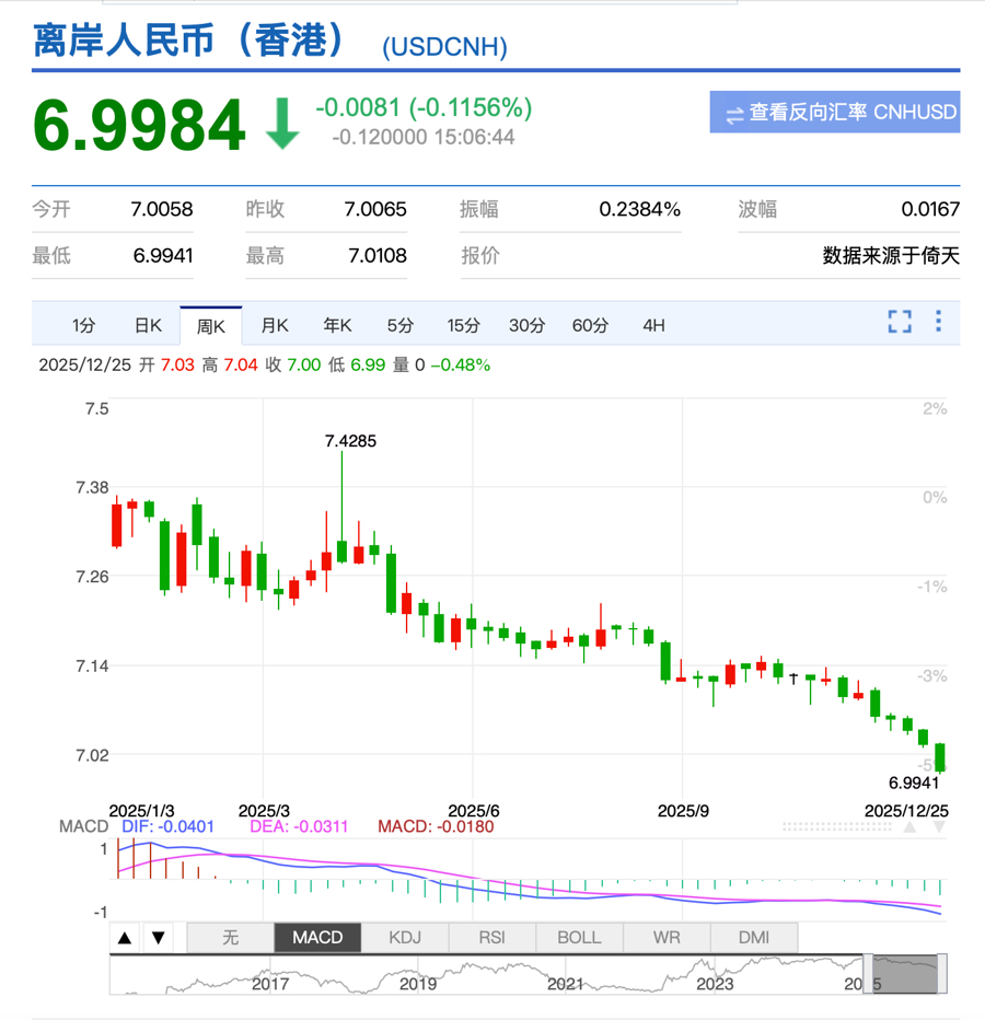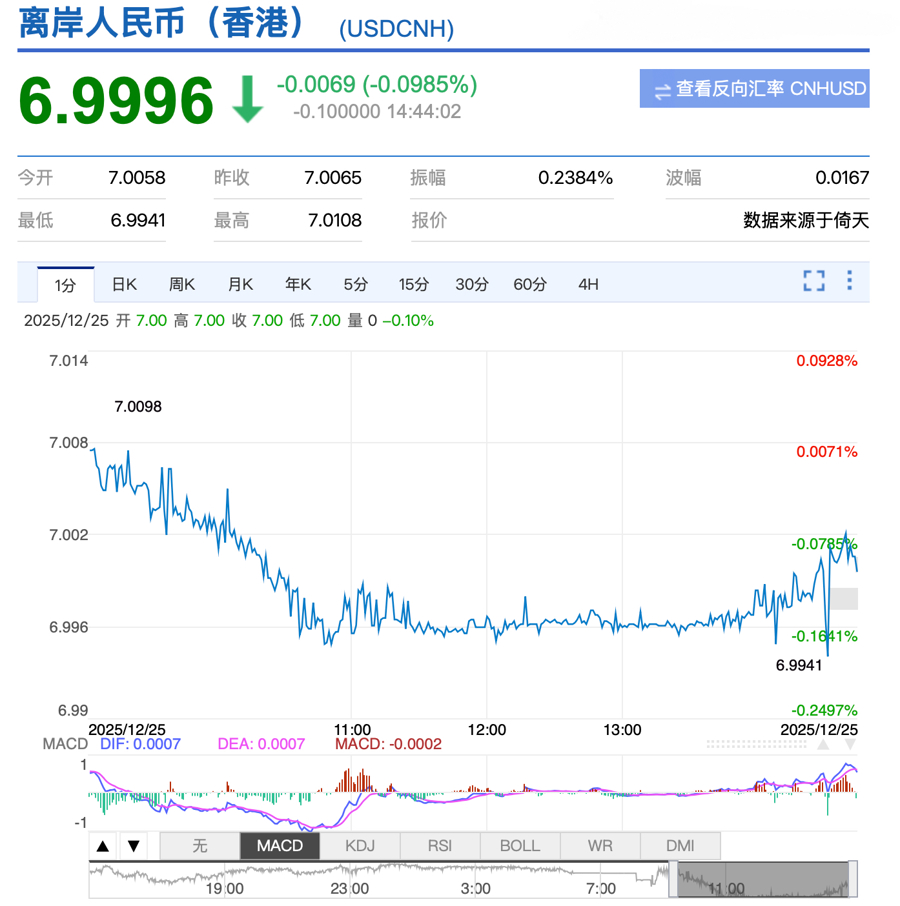 12月25日上午,离岸人民币对美元汇率续创2024年9月以来新高,收复7.0整数关口。同时,在岸市场同样表现强劲,在岸人民币兑美元汇率升破7.01元,最高触及7.0052元,逐步逼近7.0大关。